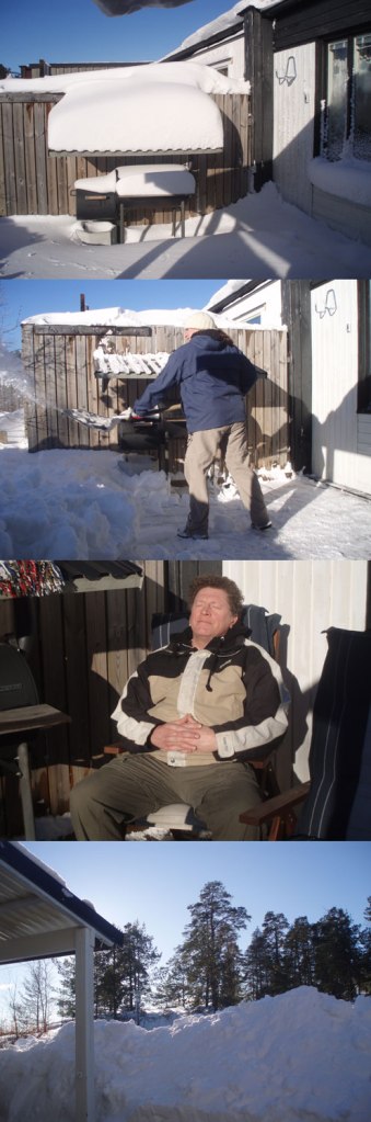 Så var det dags att skotta altan igen. Tredje gången gillt? Efter gårdagens snöstorm blev denna dag fantastisk vädermässigt. En av oss fick motion, den andre bara njöt.