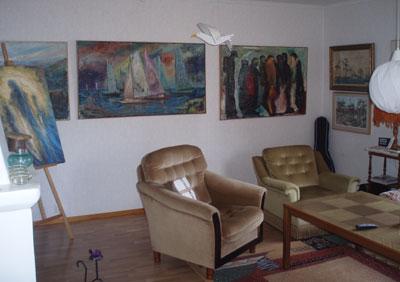 In the last load we brought some paintings that surely feel better to be on a wall than to stand in a store-room. Thus, up on the walls they went, and turned the cottage sitting room into something completely different. Somebody, will you shoot that gull, please?