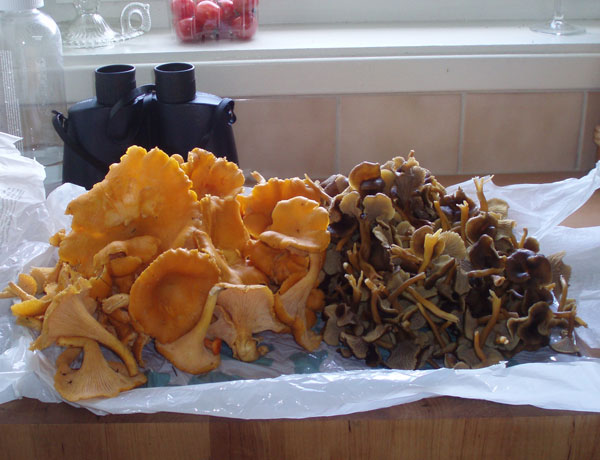We went to Finnmarken and climbed the hills there to find any occasional mushroom, Sigge dressed according to latest mushroom fashion. And we were lucky! At two spots (one á 2 square-m, one á 4 square-m) we found enough to fill our bags with the forest gold.