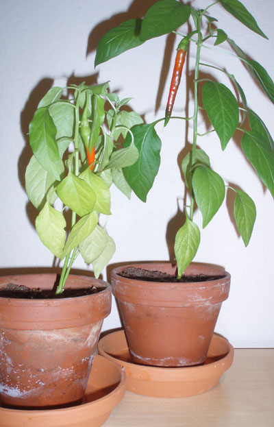 Det står några taniga chiliplantor i Hagsätra också. Och plötsligt växer frukt på två av dem, helt oväntat. Vårdnadshavaren är mycket förvånad.