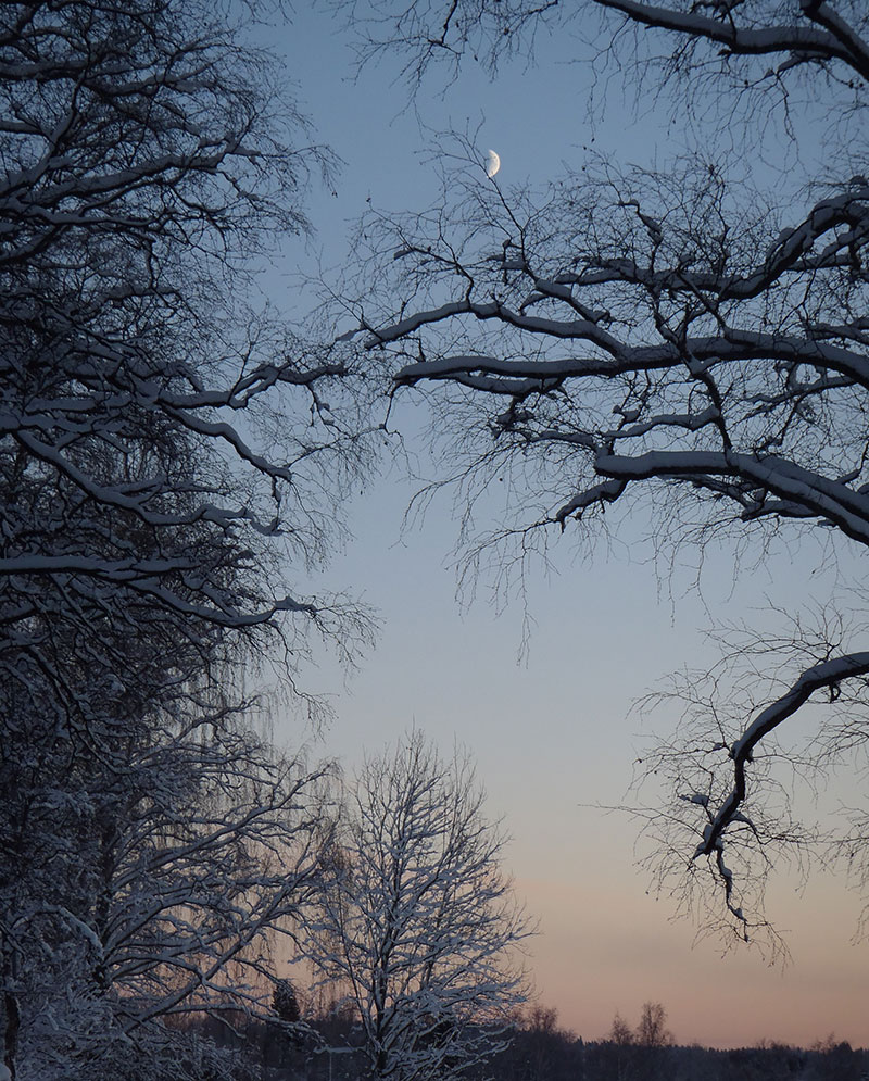 Dessa korta dagar går vi inte så långt ifrån varma soffan. Men även en liten tur kräver kamera, för det är ett fantastiskt väder, trots kylan. Det gäller att passa på medan solen är uppe. Eller månen.