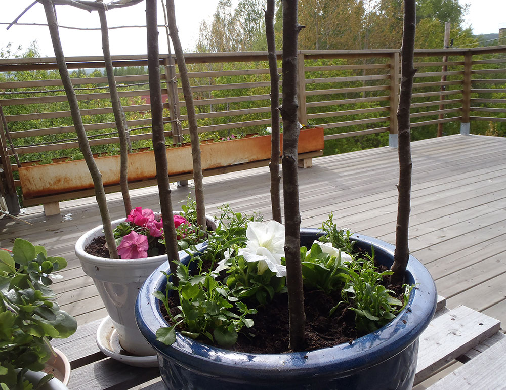 Som vanligt vill vi ha lite sommarfägring i vår absoluta närhet. Vad är då bättre än att återvinna de lysrörsarmaturer som tidigare satt i taket i butiksavdelningen i vårt hus? De har helt övergivna åldrats okontrollerat vackert. Nu hoppas vi bara på att de stackars växterna ska överleva en kall och hård början på sommaren.