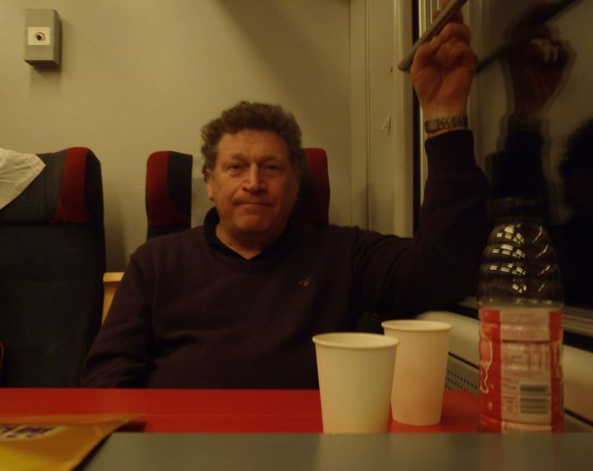 Det bar norrut. Lugn start: en bok (även lånad på biblioteket och medförd, snacka om rätt present!) och bakelse.
