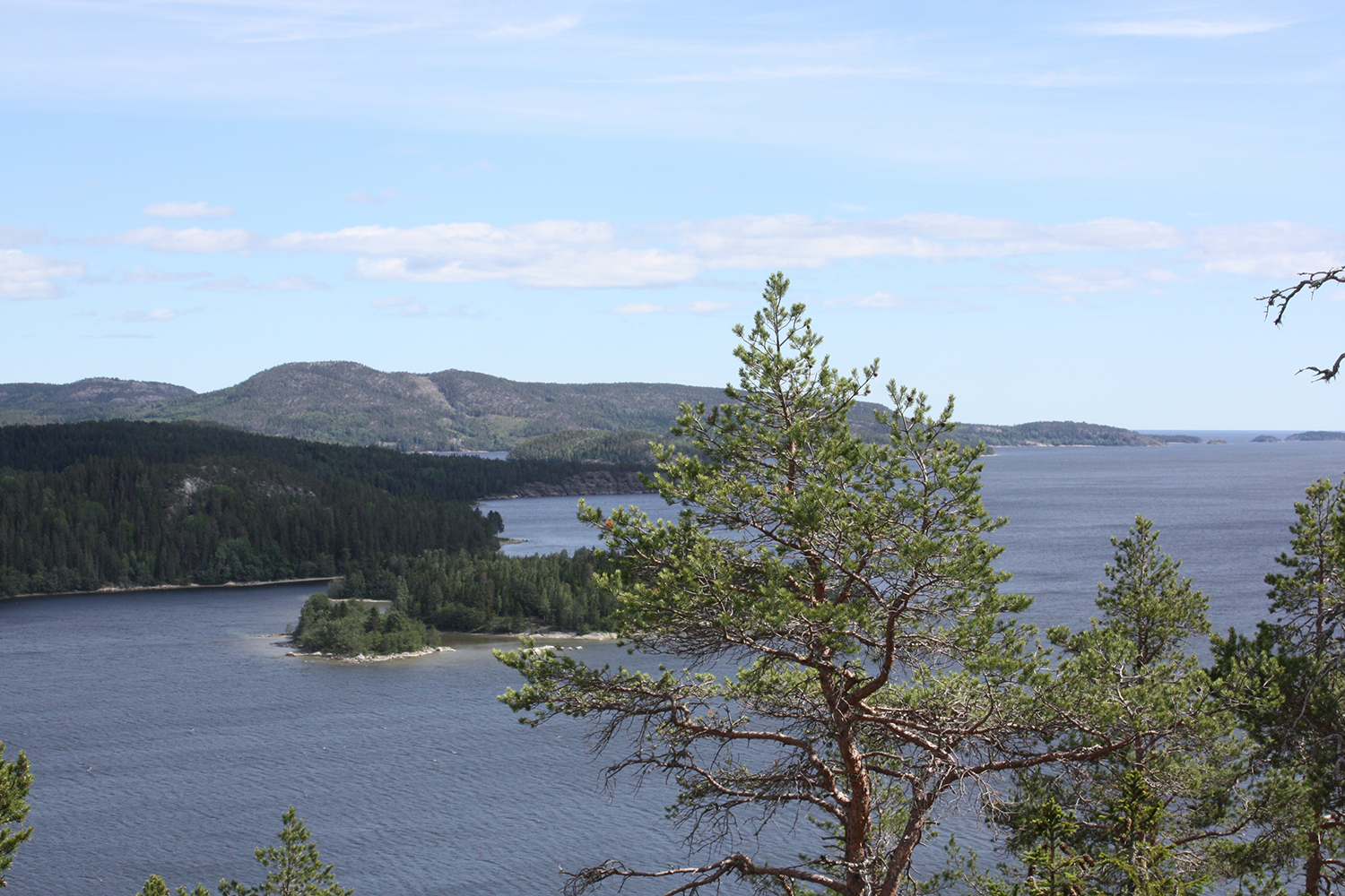 Vi gick upp till toppen, utsiktsplatsen, i blåsigt men soligt väder till skillnad från förra året. We went up to the top, to the view point in windy but sunny weather, unlike last year.Först tittade vi – Sigge – inåt land, mot bron över till Svartnoranäset. First we –Sigge – looked inland, towards the bridge over to Svartnoranäset.