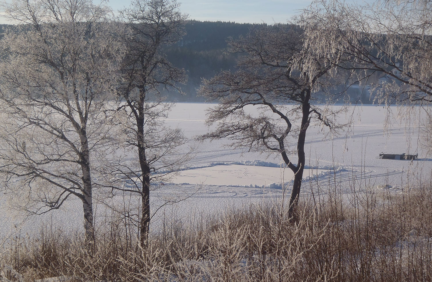 Plötsligt blev det en alldeles strålande solig dag. Några få grader under noll och fukt i luften gör världen frostig.