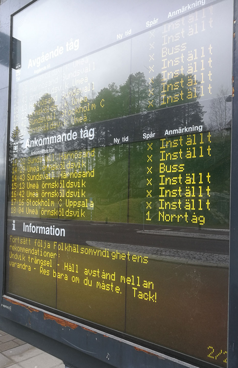 Folkhälsomyndigheten rekommenderar att vi inte ska resa i onödan. SJ och Norrtåg gör sitt bästa för att vi inte ska kunna resa alls. Nästan alla tågavgångar är inställda från Kramfors denna dag.