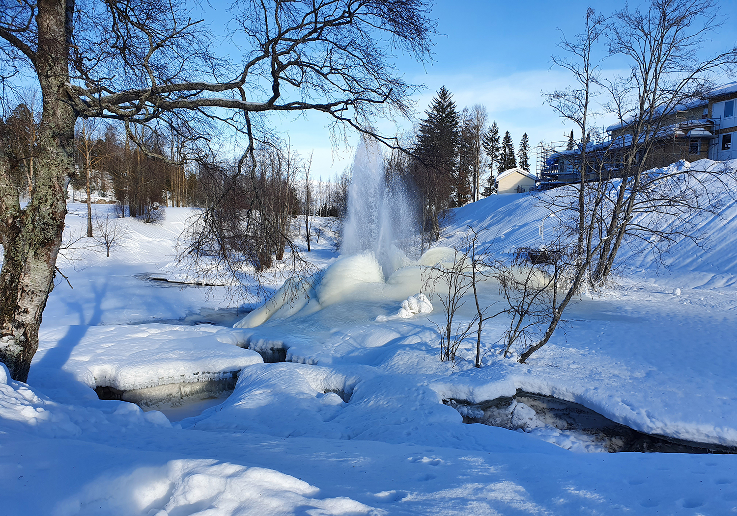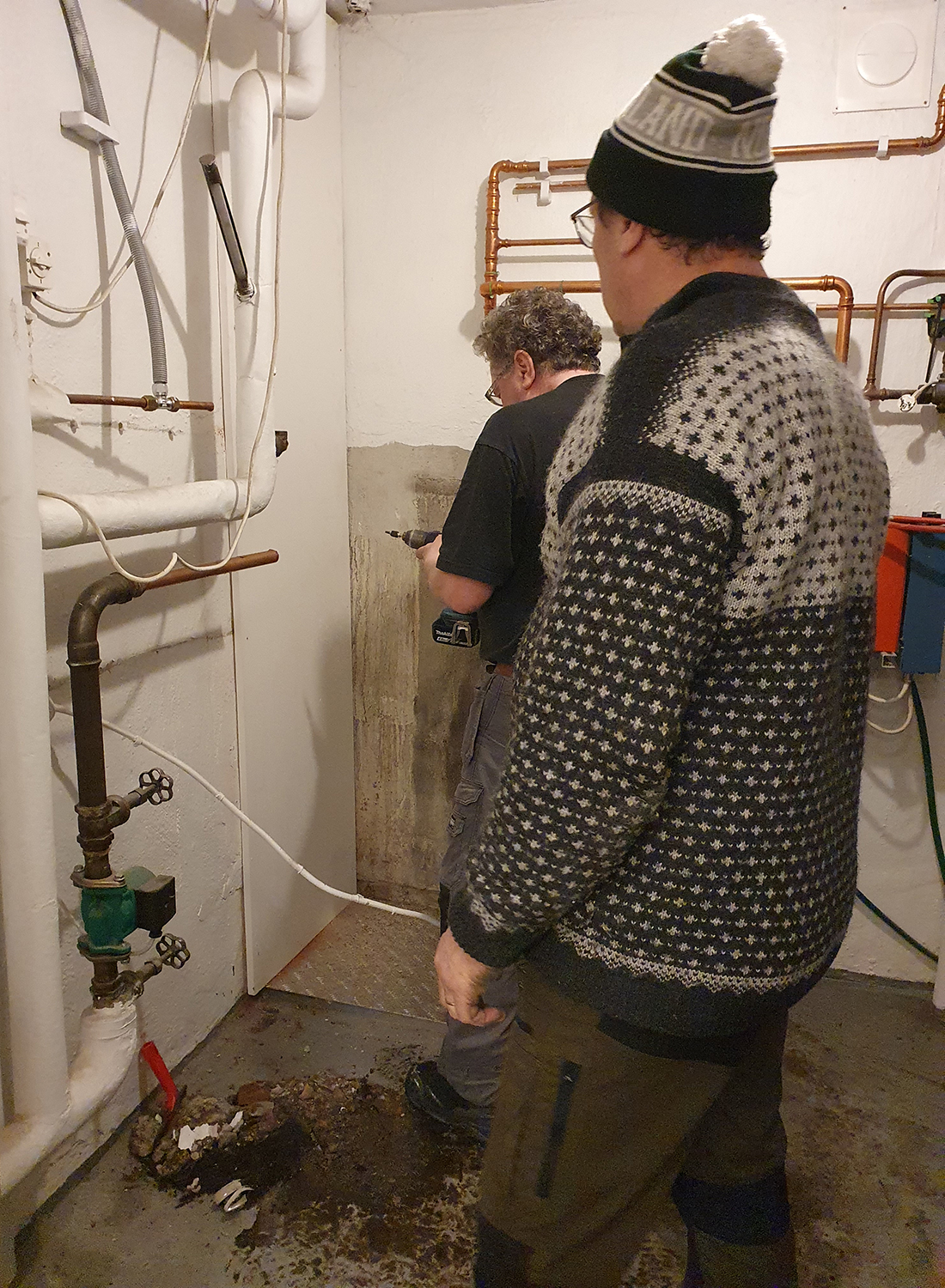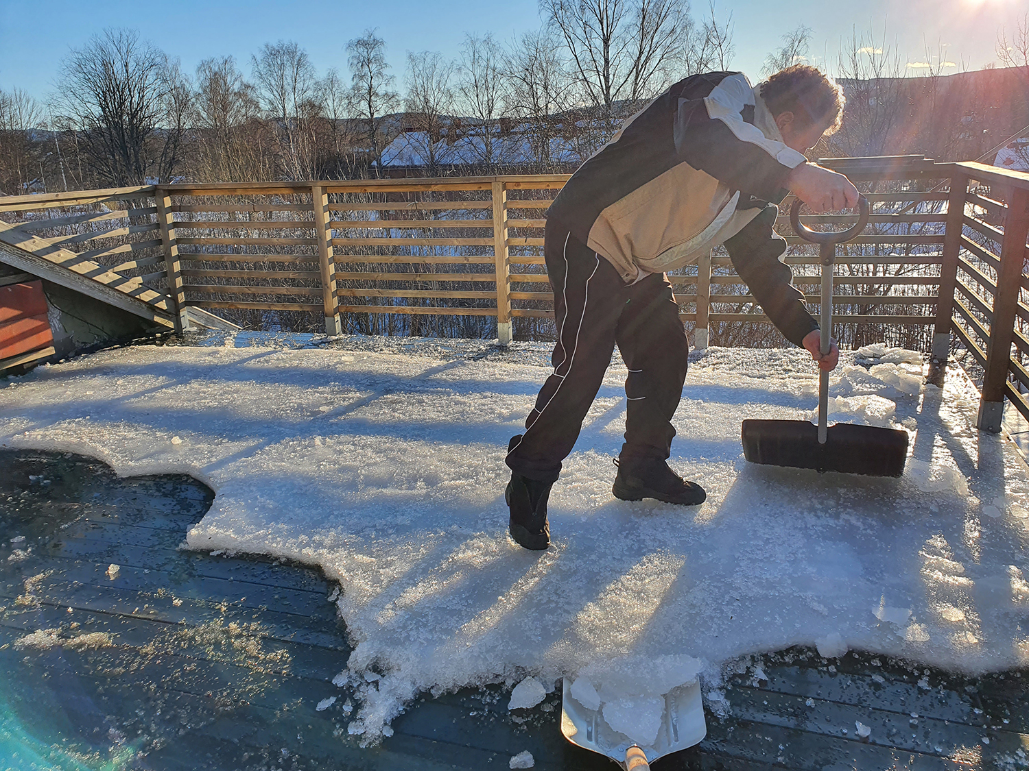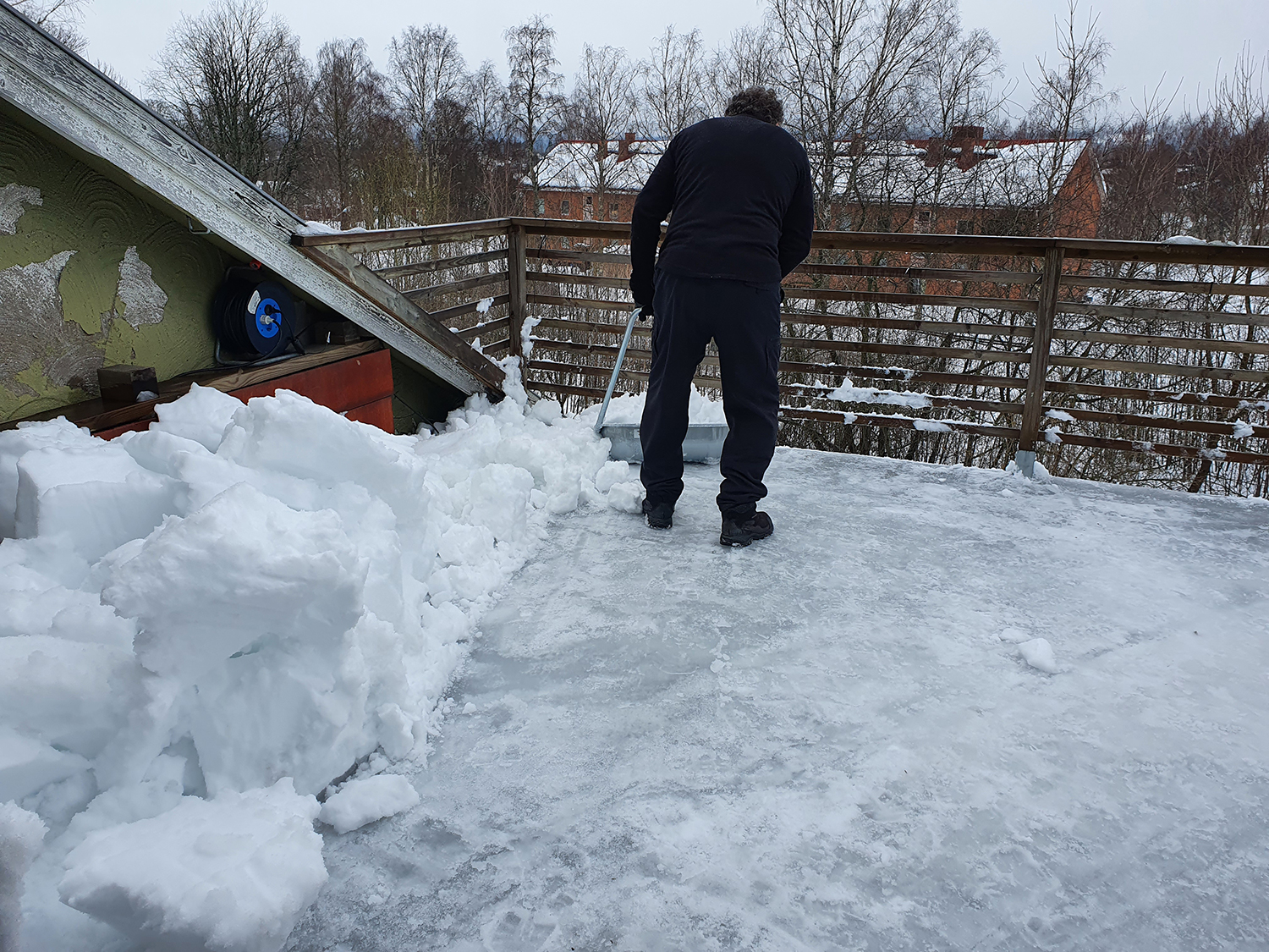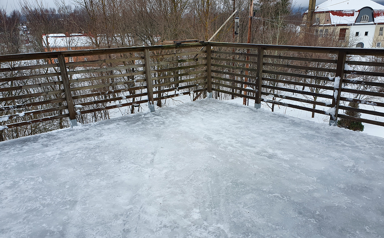 Hela altanen var täckt av is efter snöraset. Men de senaste dagarna har det varit extremt varmt så isen började smälta. Och då var det möjligt att ta bort den – bra av flera skäl.
