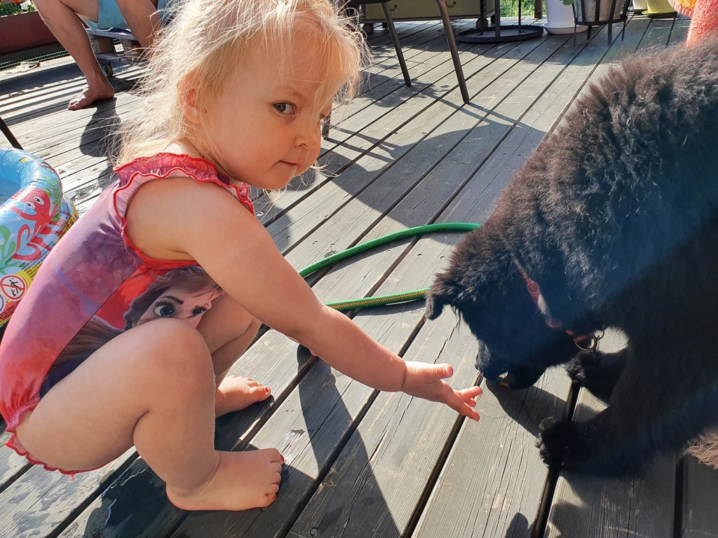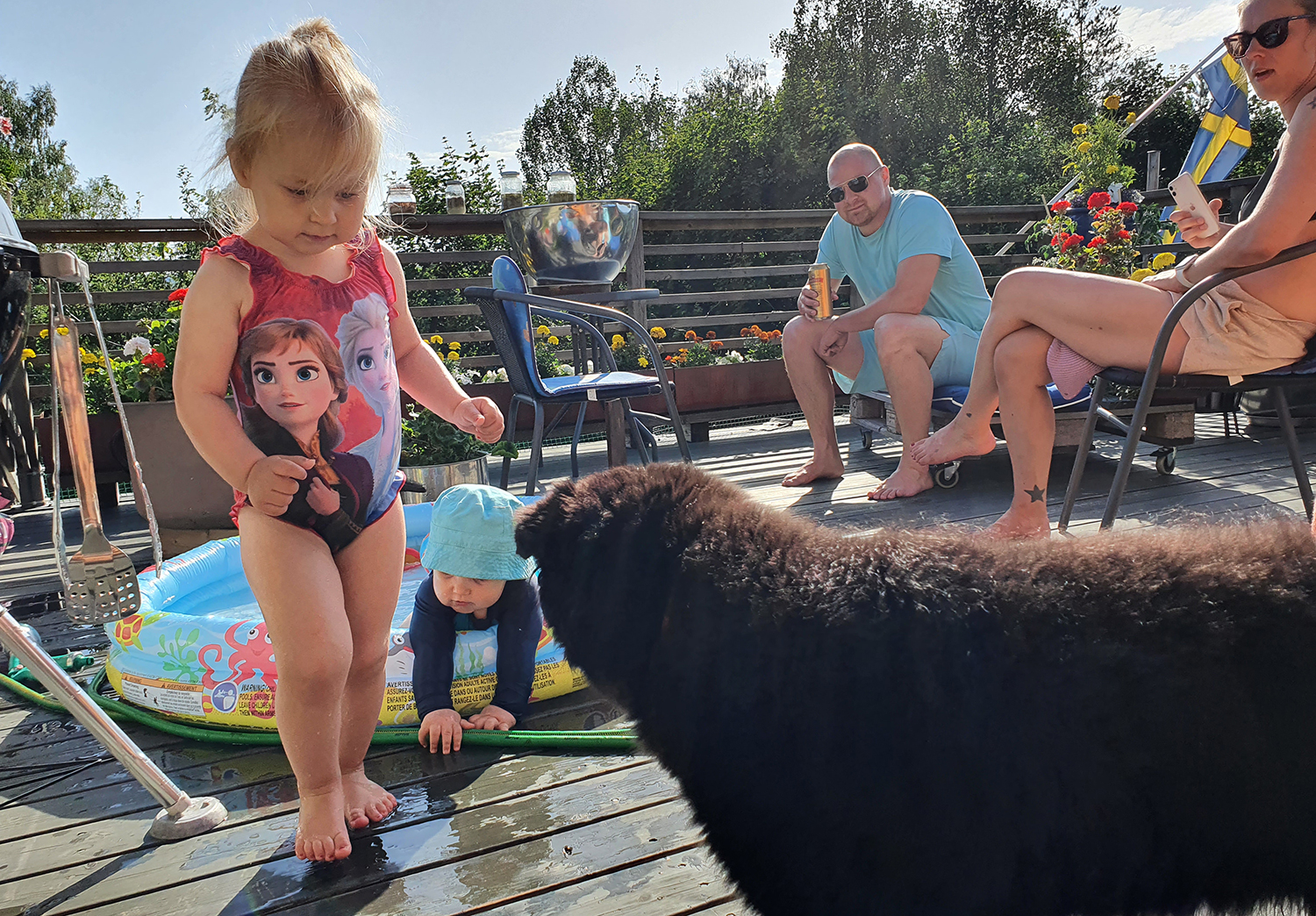 Full fart i poolen. Full speed in the pool.Tycho gör entré. Ebba tyckte om honom direkt. Tycho makes his entrance. Ebba liked him straight away.Ebba gav honom hundgodis så blev de jättekompisar. Ebba gave him ”dogsweets” and they became great friends.Så mycket kompisar att Tycho gärna ville pussa henne. So much friends that Tycho really wanted to kiss her. Photo: Elin Blomqvist.Mysstund med gullig hund. Cozy time with cute dog.Valda delar av familjen på sitt vanligaste humör. Selected parts of the family in their most common mood. Photo: Elin Blomqvist.