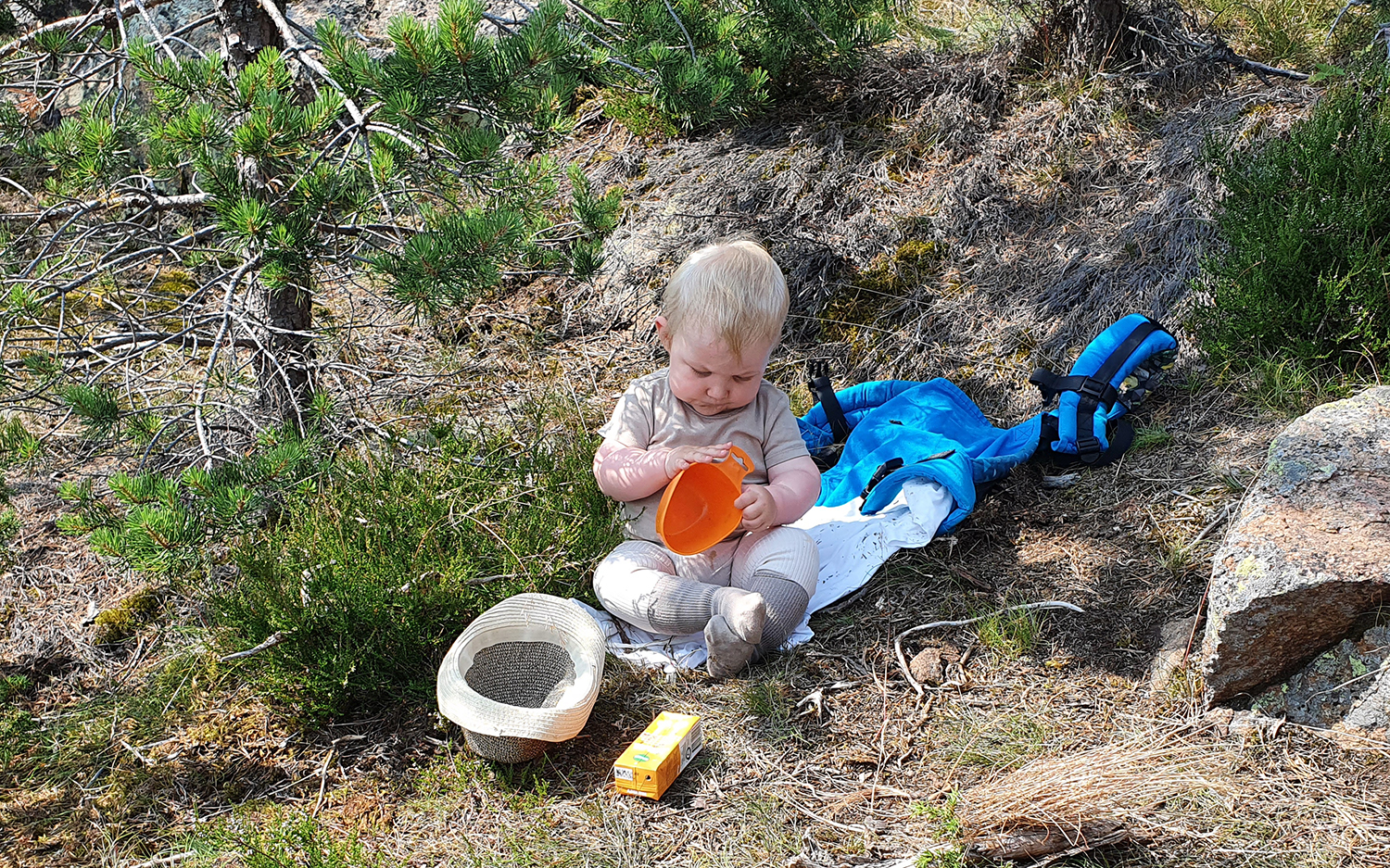 Ebba åkte på Fredriks rygg och Ludvig åkte på mammas mage. Mamma tog bilden. Ebba rode on Fredrik’s back and Ludvig rode on his mom’s belly. Mom took the picture. Photo: Elin Blomqvist.Väl uppe mötte vi (som vanligt) detta. Once up, we met (as usual) this.Obligatoriskt kaffe/saft och macka. Mandatory coffee/juice and sandwich.Sedan roade Ludvig sig själv precis som han brukar. Then Ludvig amused himself just as he usually does.Efter det blev det dags för posering. After that it was time for posing. Photo: Elin Blomqvist.Men sedan gick vi ned igen, fast ”bakvägen”. Där är det inte heller särskilt dålig utsikt. But then we went down again, by the ”back road”. There is not a very bad view there either.