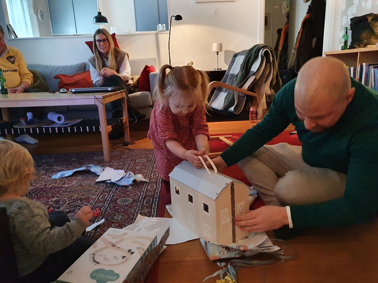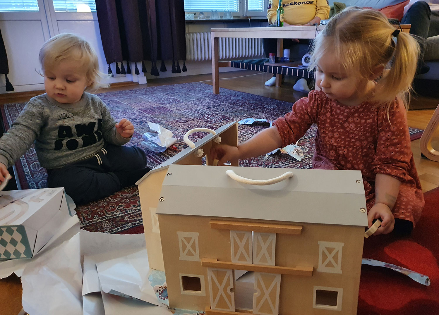 Spännande tycker Ebba, när pappa Fredrik hjälper till att öppna paketet. Ludvig tycker att papperen är lika spännande. Ebba finds it exciting when dad Fredrik helps to open the package. Ludvig thinks that the papers are just as exciting.En bärbar liten bondgård! A portable little farm!Ebba började genast placera ut djuren där de bodde. Ludvig tyckte att det var dags att öppna hans julklapp, tågbanan. Ebba immediately started placing the animals where they lived. Ludvig thought it was time to open his Christmas present, the train track.