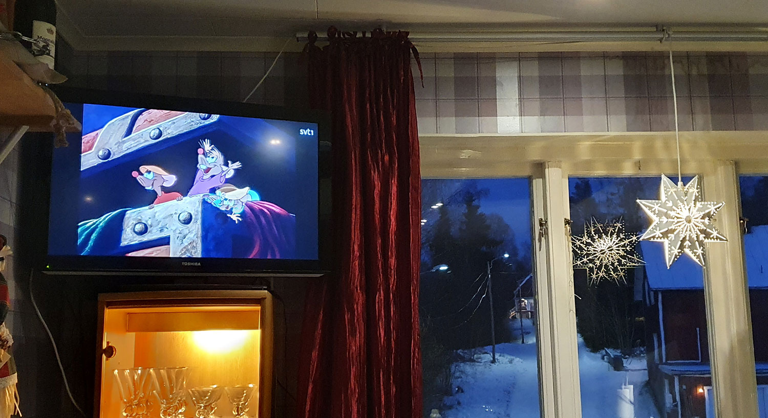 Klassiska tecknade julfilmer på tv i köket medan maten ställs i ordning. Classic Christmas cartoons on TV in the kitchen while the food is being prepared.En juldekoration blev det ändå, men den var inte till oss utan till några av våra goda grannar. There was one Christmas decoration anyway, but that was not for us but for some of our good neighbors.