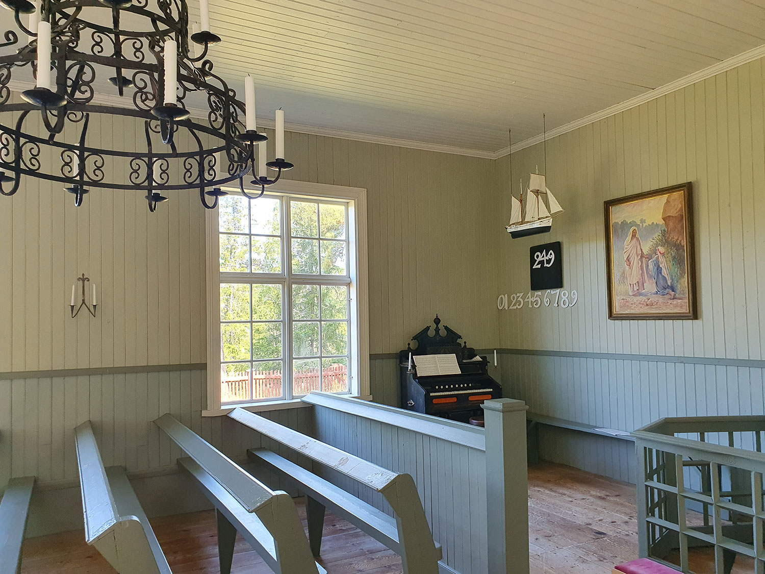 Längs stigen mot målet för vandringen fann vi denna tunna lilla brygga. Till vänster ligger en allmän bastu. Along the path towards the goal of the hike we found this thin little bridge. On the left is a public sauna.Trots den korta sträckan finns det flera platser där det står bänkar där man kan vila sig. Det behövde vi inte göra, men vi kunde i alla fall beundra utsikten från dem. Despite the short distance, there are several places where there are benches where you can rest. We didn’t have to, but at least we could admire the view from them.Fiskeläget, med en pytteliten fyr som troligen inte är till mycket hjälp för sjöfarten, men väldigt fin att titta på. The fishing port, with a tiny lighthouse that is probably not of much help to shipping, but very nice to look at.Efter den måttligt ansträngande vandringen fick vi kaffe och smörgås på bryggan i solen och den vackra omgivningen. After the moderately strenuous hike, we had coffee and sandwiches on the bridge in the sun and the beautiful surroundings.Ett besök i kapellet var ett måste. Så här står det på skylten vid stigen upp till kapellet: Berghamns kapell är ett av Sveriges största fiskarkapell. Det byggdes 1750–1752 med hjälp av Gävlefiskarna som hade Berghamn som en fast fiskehamn under sommaren. Gudstjänster hölls sommartid under senare delen av 1700-talet och under större delen av 1800-talet. Vintertid förvarades fiskeredskapen i kapellet. 1892–1894 gjordes en omfattande renovering då kapellet troligen fick sitt nuvarande utseende och byggdes ut till 250 sittplatser. Kapellklockan sattes nu i en stapel på kapellets tak. 1937 skänkte Bergs byamän kapelltomten och kapellet till Nora församling mot att församlingen skulle överta underhållet. A visit to the chapel was a must. This is what it says on the sign by the path up to the chapel: Berghamn’s chapel is one of Sweden’s largest fishermen’s chapels. It was built in 1750–1752 with the help of the Gävle fishermen who had Berghamn as a permanent fishing port during the summer. Services were held in summer during the latter part of the 18th century and during most of the 19th century. In winter, the fishing gear was stored in the chapel. In 1892–1894, an extensive renovation was carried out when the chapel probably got its current appearance and was expanded to 250 seats. The chapel bell was now placed in a bellcot on the chapel roof. In 1937, Berg’s villagers donated the chapel plot and chapel to Nora parish in exchange for the parish taking over the maintenance.Berghamns kapell, den välhållna interiören. Berghamn’s chapel, the well-kept interior.Predikstolen. The pulpit.Orgeln. The organ.