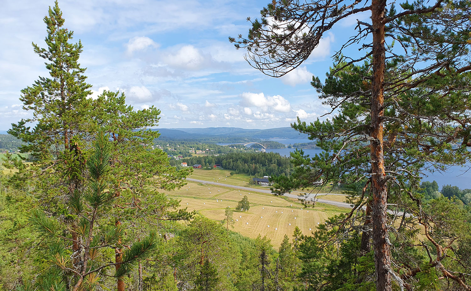 Denna fina skylt står i början av stigen som är den hittills bäst markerade av alla vandringstipsstigar vi gått på. This nice sign is at the beginning of the path, which is so far the best marked of all the hiking tip paths we have followed.Efter en kort vandring öppnade sig denna vy – Sandöbron. After a short hike this view opened up – Sandöbron (Sandö Bridge). Uppe på toppen var det fin utsikt men väldigt många träd i vägen. Vi trodde att man skulle kunna se fjärden på andra sidan toppen, men det gick inte för alla träd. Sigge ser till att hans trasiga knän inte far illa av äventyret. Up at the top there was a nice view but a lot of trees in the way. We thought we would be able to see the bay on the other side of the peak, but it wasn’t possible for all the trees. Sigge makes sure that his broken knees are not hurt by the adventure.Men vi var rätt nöjda med den här utsikten. Sandöbron och Klockestrand. But we were quite happy with this view. Sandöbron and Klockestrand.