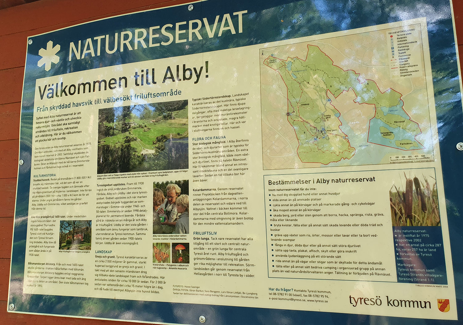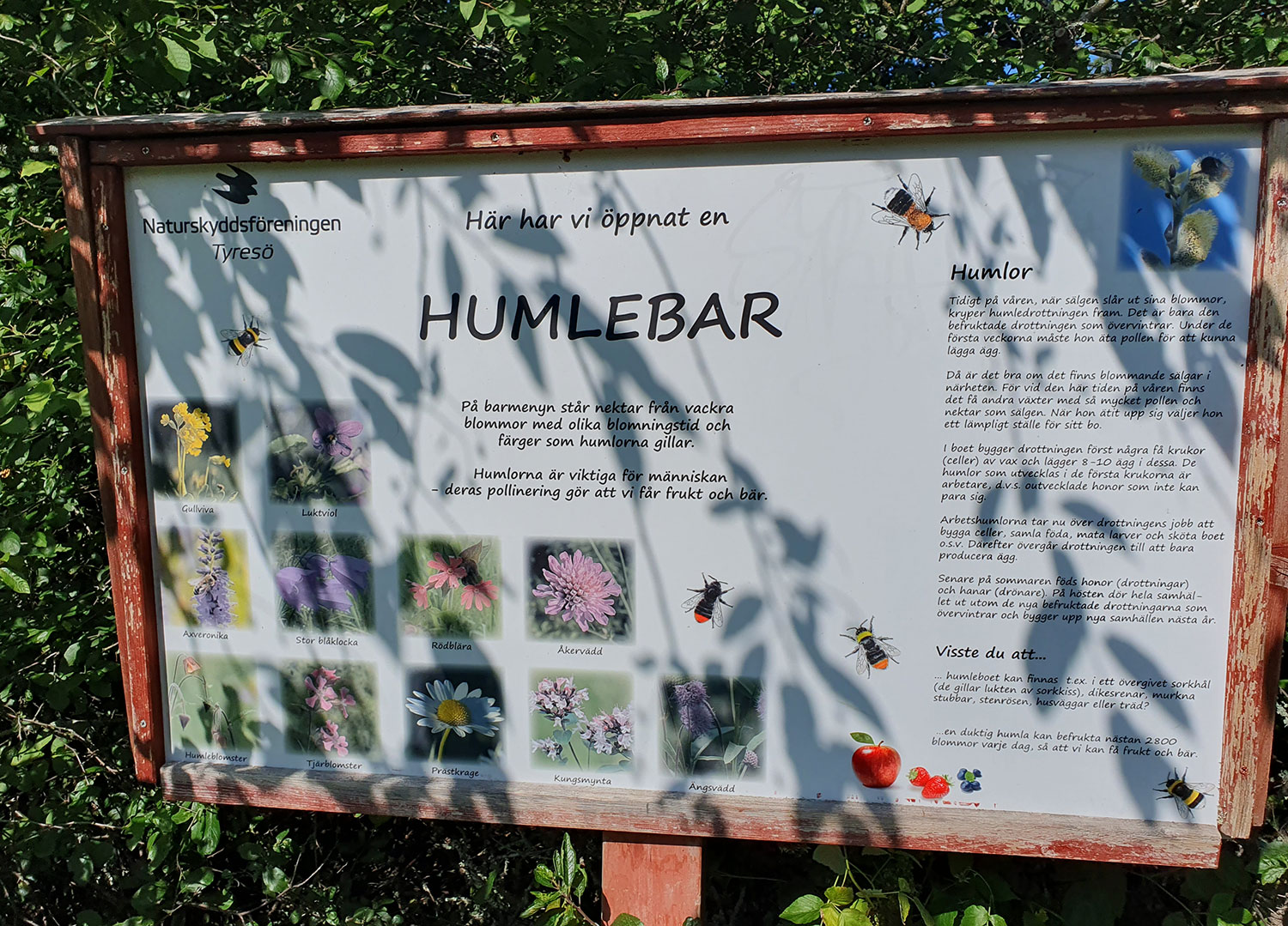 Förhållningsregler, vad man får och inte får göra inom naturreservatet. Och lite allmän information förstås. Behavior rules, what you can and cannot do within the nature reserve. And some general information, of course.Faunadepå byggd av stockar från olika trädslag. Syftet är att bevara och öka den biologiska mångfalden i naturreservatet. Insekter lägger ägg och deras larver gnager gångar som andra insekter, som bin och rovsteklar, kan använda som bon. Larverna lockar också till sig hackspettar och andra fåglar som äter dem. Fauna depot built from logs from different tree species. The purpose is to preserve and increase biological diversity in the nature reserve. Insects lay eggs and their larvae gnaw passages that other insects, such as bees and hornets, can use as nests. The larvae also attract woodpeckers and other birds that eat them. Hästar är vanligare än kor numera. Kor är bättre för den biologiska mångfalden. De betar på ett sätt som inte ”kväver” marken och gödslar den så att fler pollinerande insekter trivs. Hästar betar marken för hårt. Horses are more common than cows these days. Cows are better for biodiversity. They graze in a way that does not ”choke” the soil and fertilize it so that more pollinating insects thrive. Horses graze the ground too hard.Nils har redan sett sig mätt på hästarna. Full fart framåt! Nils has already seen enough of the horses. Full speed ahead!Stopp vid gethägnet. Göingeget är en medelstor lantrasget, ganska grov och raggig, nyfiken och social. Stop at the goat fence. The Göinge goat is a medium-sized country breed, rather rough and shaggy, curious and social. Linderödssvin, Sveriges enda oförädlade svenska lantras av svin, härstammar från Skåne. Medelstorlek (hanen, galten, väger ca 250 kg och honan, suggan, ca 150 kg). Medellivslängd 8–10 år men en del kan bli upp till 20 år. Linderödssvinen trivs bäst utomhus, även på vintern. Dessa två systrar heter Gun och Greta. Linderöd pig, Sweden’s only unrefined Swedish land breed of pig, originates from Skåne. Average size (the male, the boar, weighs approx. 250 kg and the female, the sow, approx. 150 kg). Average lifespan 8–10 years but some can live up to 20 years. Linderöd pigs thrive best outdoors, even in winter. These two sisters are called Gun and Greta. Gotlandskanin har utvecklats ur den svenska lantraskaninen som idag är utdöd. Fullvuxen väger den 3–4 kg. De växer långsamt, basfödan är hö eller gräs och örter på sommaren. The Gotland rabbit has evolved from the Swedish country rabbit, which is now extinct. Fully grown, it weighs 3–4 kg. They grow slowly, the basic food is hay or grass and herbs in the summer. Humlebar. Humlor är nödvändiga för den biologiska mångfalden. En duktig humla kan befrukta nästan 2 800 blommor varje dag så att vi kan få frukt och bär, står det på skylten. Bumblebee bar. Bumblebees are essential for biodiversity. A good bumblebee can fertilize almost 2,800 flowers every day so that we can get fruit and berries, the sign says. Själva humlebaren ser ut så här, massor av blommor i färger som humlor gillar och med olika blomningstid. Blommorna ger nektar som humlorna vill ha. The bumblebee bar itself looks like this, lots of flowers in colors that hops like and with different blooming times. The flowers provide nectar that the bumblebees want. Stopp vid bikuporna, där Nils får lära sig varifrån honung kommer. Biverket och Tyresö kommun samarbetar för att öka antalet bin och därmed pollineringen. Det sägs att globalt sett är en tredjedel av den mat vi äter beroende av pollinerande insekter och 85 % av pollineringen görs av honungsbin. Det stora problemet är att antalet bin minskar drastiskt, eftersom det industriella jordbruket förstör deras levnadsbetingelser, liksom våra ”monokulturella” trädgårdar. Stop at the beehives, where Nils learns where honey comes from. The Bee Agency and Tyresö municipality are working together to increase the number of bees and thus pollination. It is said that globally one third of the food we eat depends on pollinating insects and 85% of pollination is done by honey bees. The big problem is that the number of bees is drastically decreasing, because industrial agriculture destroys their living conditions, as are our ”monocultural” gardens. Bikuporna. De ligger nära humlebaren så vi får anta att humlorna får dela med sig en del. The hives. They are close to the bumblebee bar, so we can assume that the bumblebees get to share some.