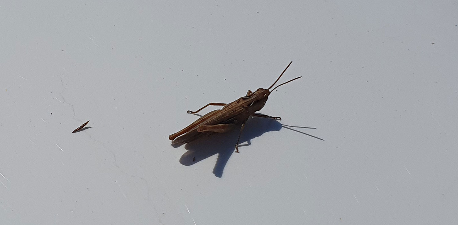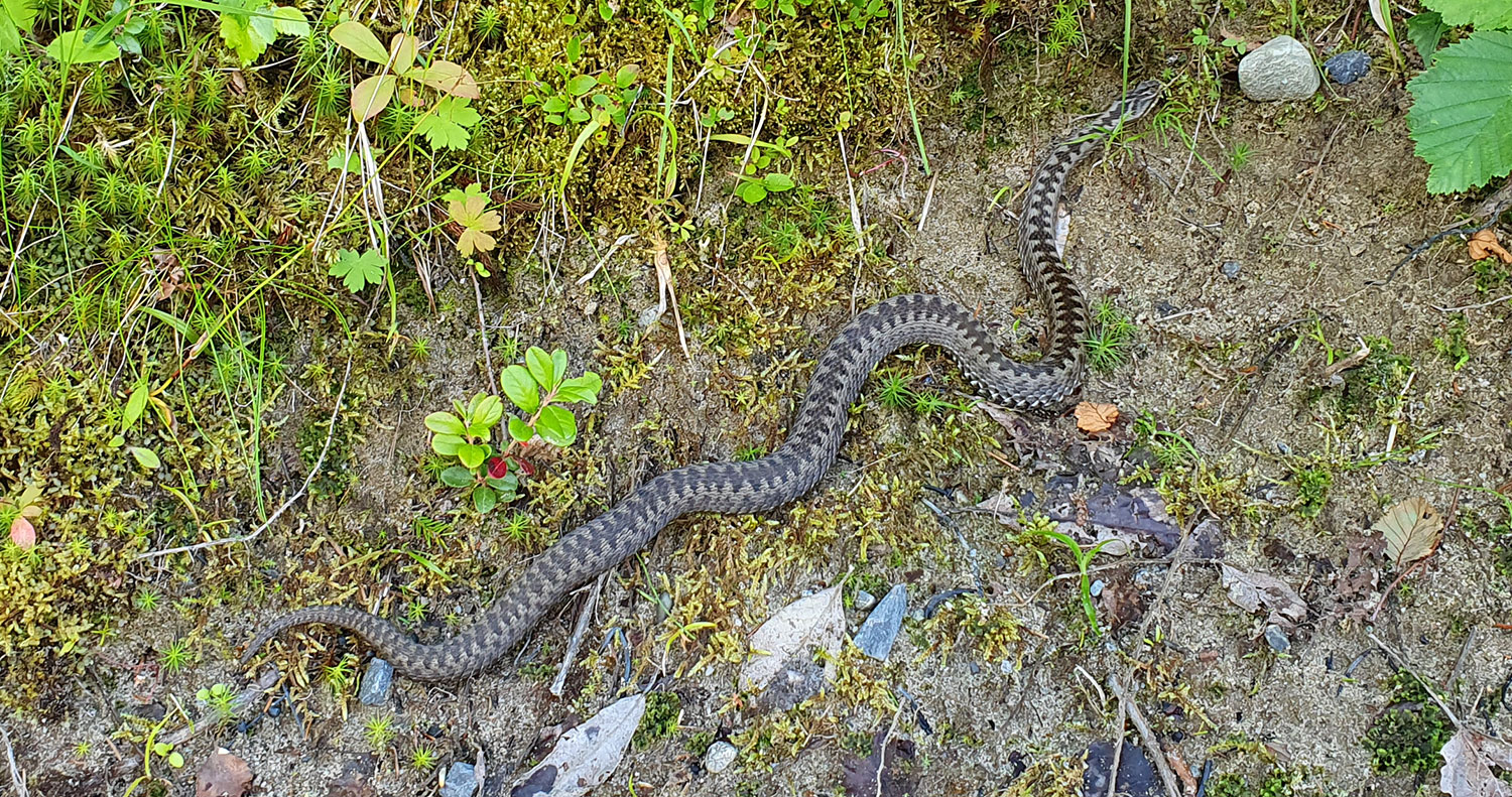 Det var en väldigt vacker trakt vi kom till. På vägen ner fick vi sällskap av en äldre herre som bor i just detta hus och han berättade att de endast åtta familjer som bor just här hjälps åt att hålla ordning på markerna. It was a very beautiful area we came to. On the way down we were joined by an elderly gentleman who lives in this particular house and he told us that the only eight families who live here help to keep the grounds in order.Tidigt under promenaden passerade vi denna fina grupp med kvigor. Early on in the walk we passed this fine group of heifers.På ena sidan om den allt brantare stigen ligger Edsviken. Även den värd att se. On one side of the increasingly steep path lies Edsviken. Also worth seeing.Uppe på berget. Första anblicken av utsikten: Storsandviken. Up on the mountain. First glimpse of the view: Storsandviken.På vägen ner såg vi denna kamrat, en huggorm. Den låg uppe på vägen men ringlade snabbt iväg när vi kom för nära. On the way down we saw this fellow, a viper. It was up on the road but quickly wriggled away when we got too close.Framme vid bilen igen, hittade vi en ny kamrat, en syrsa. Back at the car, we found a new companion, a cricket.