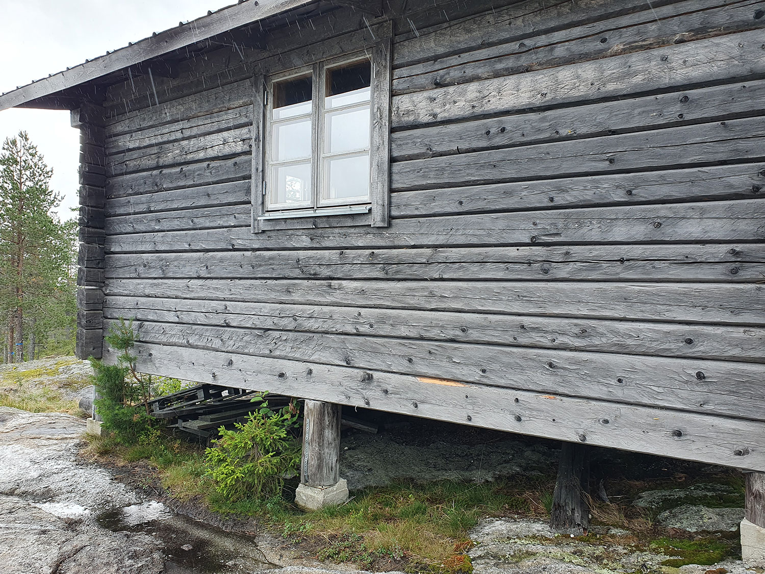 Hälsostugan. Det började regna ganska ordentligt när vi var där, så vi tog skydd inne i den – den står öppen vilket är rätt fantastiskt. ”The Health Lodge.” It started raining quite hard when we were there, so we took shelter inside it – it’s open which is pretty amazing.Efter en stund lugnade regnet ner sig så vi kunde gå ut igen. En glimt av Ångermanälven därborta. After a while the rain calmed down so we could go out again. A glimpse of river Ångermanälven over there.Så var det bara att gå tillbaka igen, i måttlig nederbörd. Then it was just a matter of going back again, in moderate rainfall.På vägen passerade vi denna myr (som vi naturligtvis hade passerat på vägen upp också). On the way we passed this marsh (which of course we had passed on the way up, too).