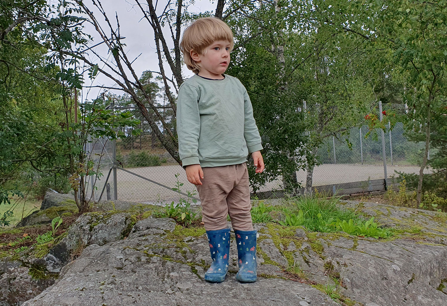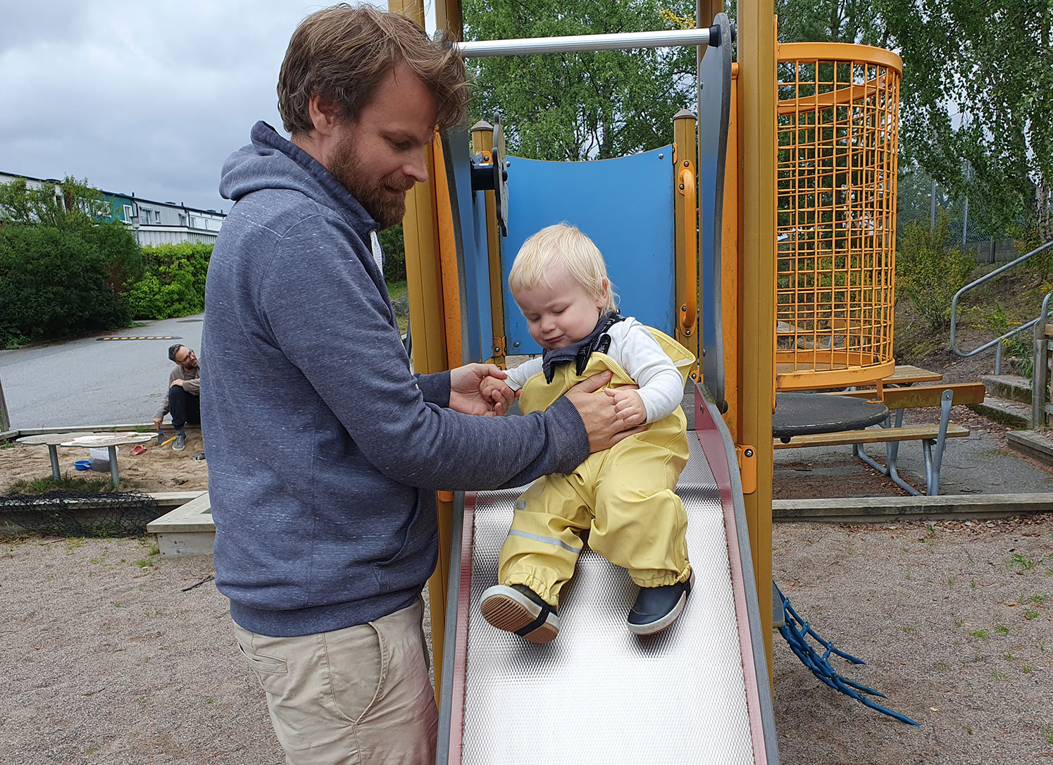 På plats i Tyresö måste vi förstås dricka lite kaffe och äta något gott till – rulltårta. On site in Tyresö, of course, we had to drink some coffee and eat something delicious – Swiss roll.Hugo har munnen full med kex. Mamma Elin håller ett öga på Kasper. Hugo has a mouth full of biscuits. Mom Elin keeps an eye on Kasper.Sedan gick vi ut eftersom det trots allt inte regnade, som vi trodde att det skulle göra. Kasper cyklade riktigt bra på sin lilla cykel. Men den är för liten så han kommer att få en ny när han fyller år i september. Men det är en hemlighet. Då kanske Hugo får ärva den lilla cykeln. Then we went outside because after all it wasn’t raining like we thought it would. Kasper rode really well on his little bike. But it is too small so he will get a new one for his birthday in September. But that’s a secret. Then maybe Hugo will get to inherit the little bike.Målet för den lilla utflykten var en lekplats i närheten. Hugo ville genast åka rutschkana. Det gick bra med hjälp av pappa Jonas. The goal of the little excursion was a playground nearby. Hugo immediately wanted to ride the slide. It went well with the help of dad Jonas.Kasper åkte förstås också rutschkana. Men han är så stor att han klarar det helt själv. Of course, Kasper also rode the slide. But he is so big that he can do it all by himself.En gungbräda fanns det också, som Hugo måste prova. Även här med hjälp av pappa. There was also a teeter, which Hugo had to try. Here also with the help of dad.Efter en stund blev det två på gungbrädan, när Kasper också skulle gunga. After a while there were two on the teeter, when Kasper would also swing.Efter en stund tyckte Kasper att det var dags för något annat äventyr, så han klev av. After a while, Kasper thought it was time for another adventure, so he got off.Det äventyret var att klättra i berg, även om just detta berg inte var jättehögt. Men rätt spännande ändå. Se även toppbilden. That adventure was mountain climbing, although this particular mountain was not very high. But still quite exciting. See also the top picture.