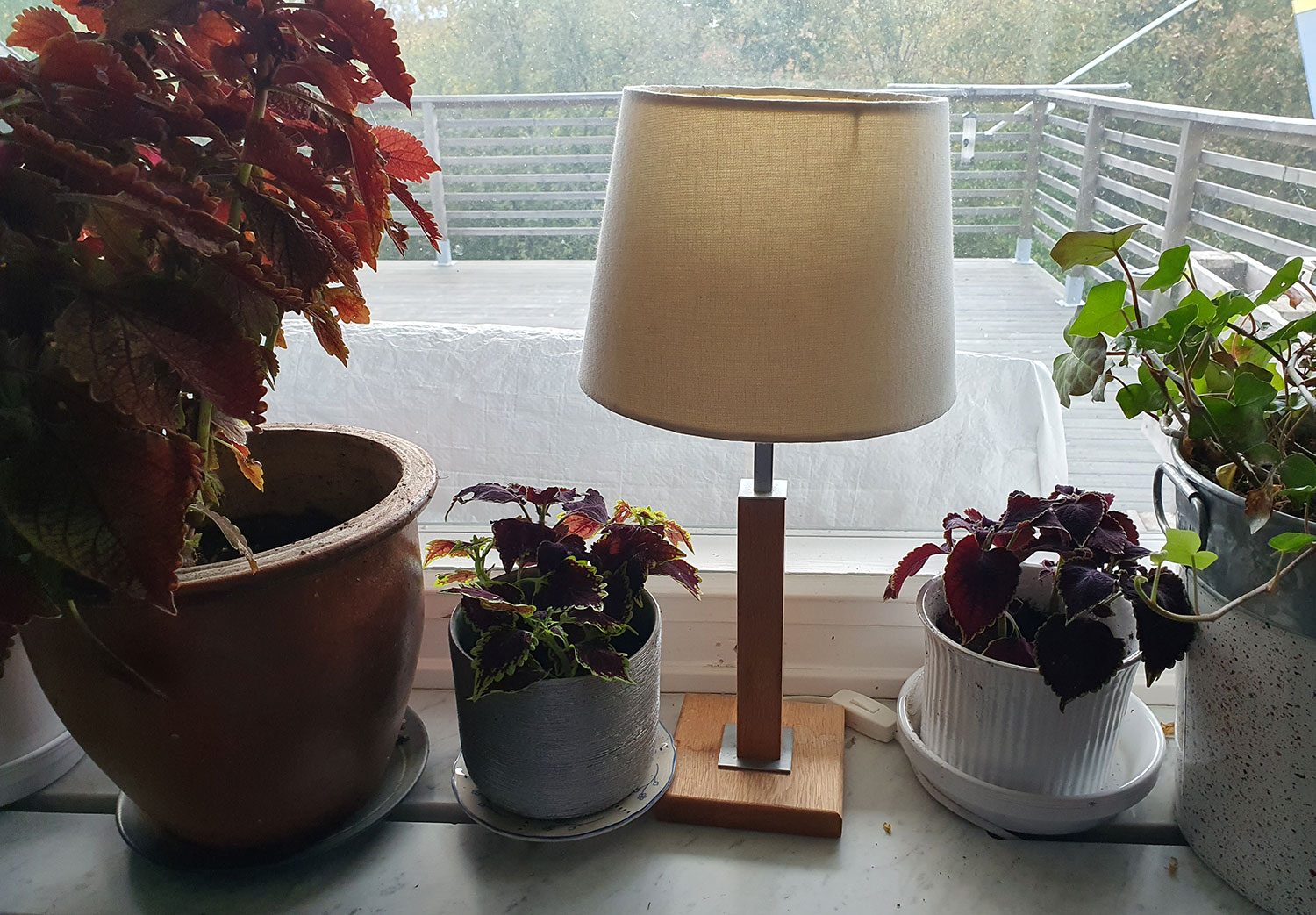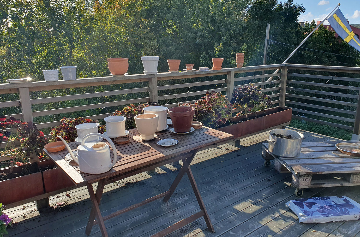 Först kom palettbladen in i stora krukor tillsammans med några till stora växter. De tog väldigt mycket plats. First, the coleus went into large pots along with some more large plants. They took up a lot of space.Som sagt de tar väldigt mycket plats. Och ännu mer plats tar krukan med ros och silverek. As said, they take up a lot of space. And even more space is taken up by the pot with rose and silver oak.Så vi tänkte ändrade oss och tog mest sticklingar i stället i mindre krukor som får plats i fönstren. So we changed our mind and took mostly cuttings instead in smaller pots that fit in the windows.Till sist blev det 18 krukor med 3–4 sticklingar i varje, plus en stor kruka med växten som den är. In the end, there were 18 pots with 3–4 cuttings in each, plus a large pot with the plant as it is.Till vänster den som kom in som den är plus några av sticklingkrukorna. On the left is the one that came in as is plus some of the cutting pots.Stora plantan och framför den ett par plantor med paprika och chili (som vi inte vill slänga) plus det enda av våra citronträd som vi har kvar. The big plant and in front of it a couple of pepper and chilli plants (which we don’t want to throw away) plus the only one of our lemon trees that we have left.