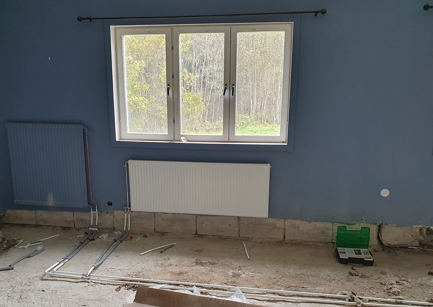 Finally, things are starting to happen again. And nothing bad that doesn’t have something good in it. With this we are getting help installing a couple more radiators in the large room (see above), and also the radiators in the workroom are back up and running as it became possible to connect them.