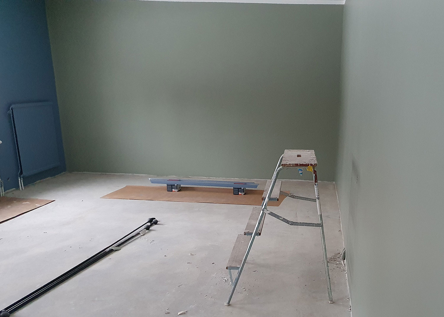 Målning pågår i stora rummet. De nya elementen har också fått väggens färg. Painting in progress in the large room. The new radiators have also been given the color of the wall.Gröna delen i rummet. The green part of the room.Nymålat golv i spaet. Längre fram kommer panelen att sättas tillbaka. Newly painted floor in the spa. Further forward, the panel will be put back.