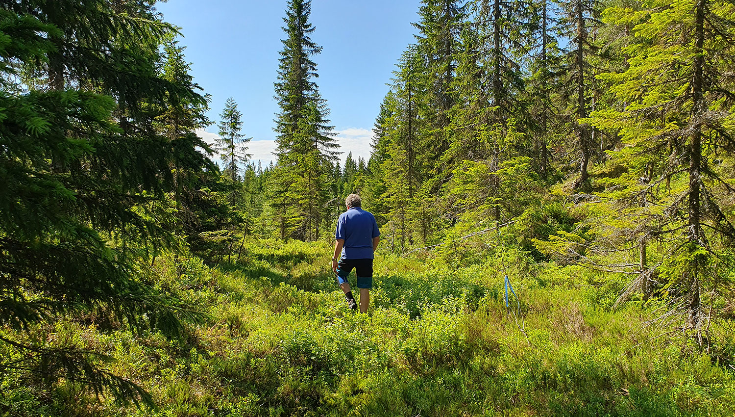 Det verkar inte vara många som har gått denna väg, så det var tur att leden var väl markerad. Just här en ganska enkel transportsträcka. Det blev bra mycket brantare längre fram. Not many people seem to have walked this way, so it was fortunate that the trail was well marked. Right here a fairly simple transport route. It got a lot steeper further on.Här trodde vi att vi var framme vid målet. Vi hade fel. Here we thought we had arrived at the goal. We were wrong.Långt därnere ligger Butjärnens badplats. Far below is Butjärnen’s bathing place.När vi äntligen kom fram till rätt ställe såg det ut så här. When we finally got to the right place, it looked like this.