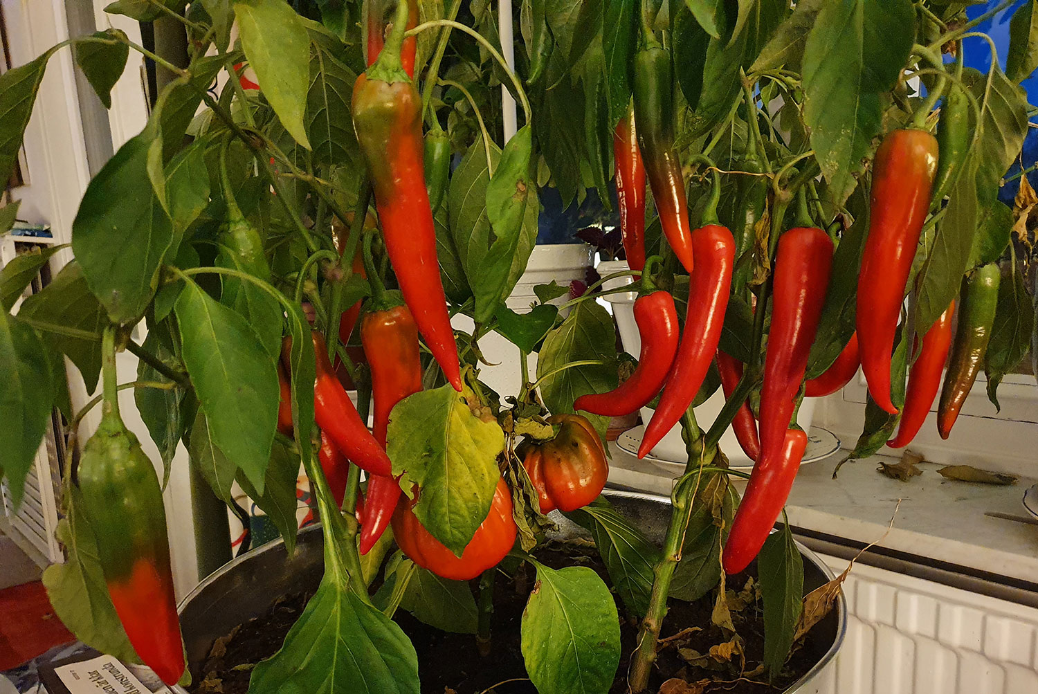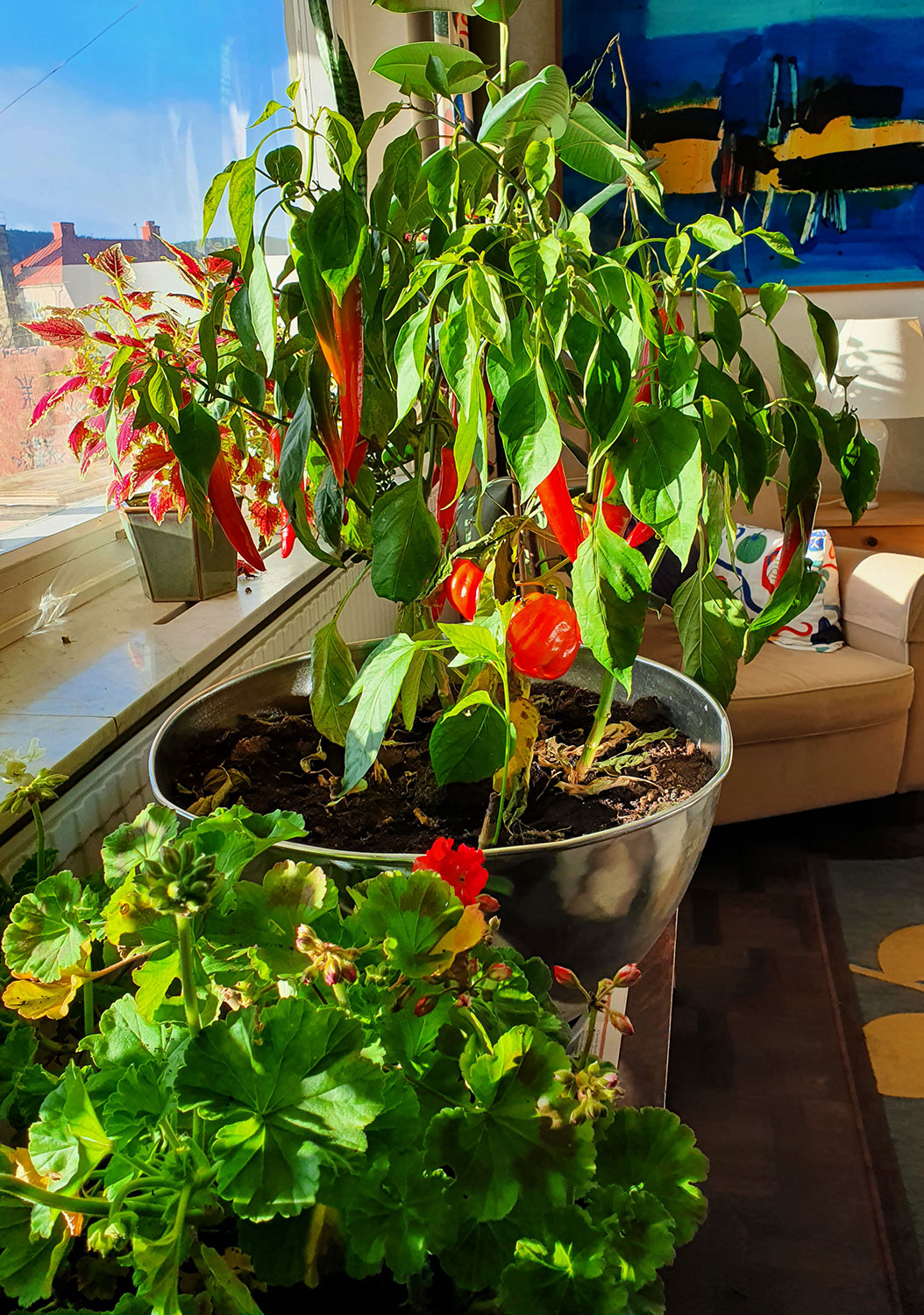 Just den här har inte fattat att den snart kommer att frysa ihjäl, men det är ju bara trevligt. Den får stanna ute tills den inte klarar mer. This one has not figured out that it will soon freeze to death, but that’s just nice. It will stay out until it can no longer cope.Paprikor och chiliplantor och ett helt gäng med pelargoner fick flytta in. Peppers and chili plants and a whole bunch of geraniums had to move in.Man kan ju inte låta de här frysa ihjäl. You can not let these freeze to death.