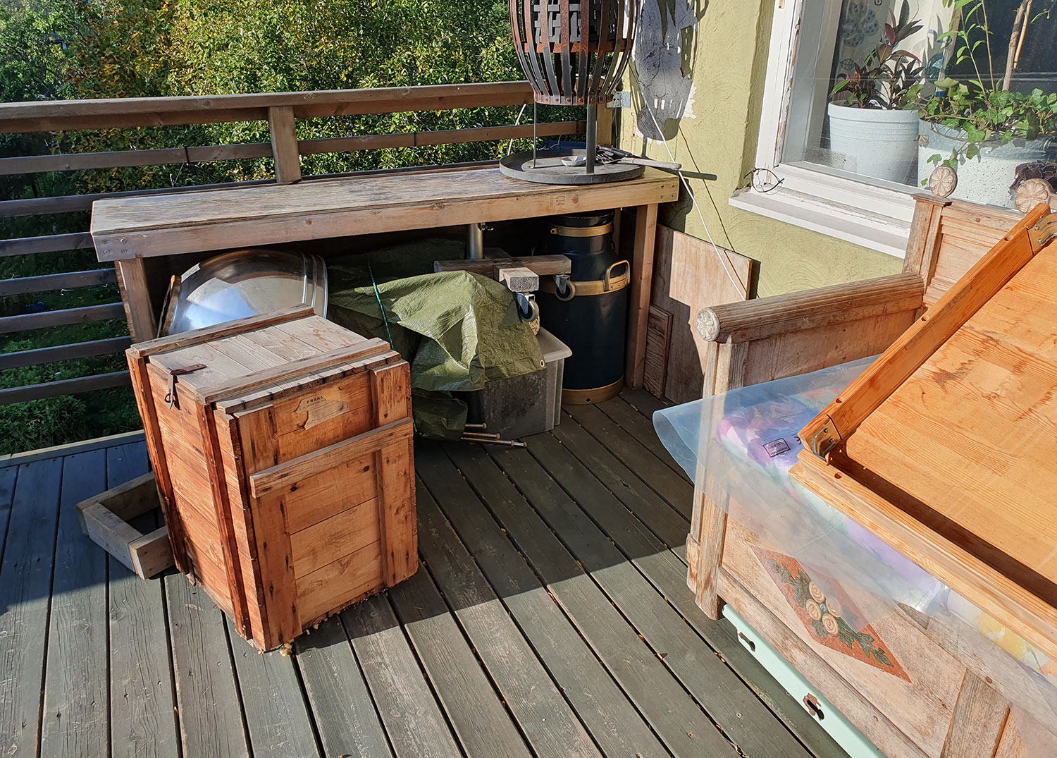 Vi ställde den nya stora grillen alldeles till höger om dörren ut på altanen, inslagen eftersom det är en gasolgrill. Den gamla kolgrillen som vi hade förr fick bara stå som den var. We put the new large grill just to the right of the door onto the balcony, tucked in because it’s a gas grill. The old charcoal grill that we used to have was just left as it was.Stolarna hamnade under det lilla sidobordet i år, där tar de mycket mindre plats. Bordet som vanligt ovanpå soffan. The chairs ended up under the small side table this year, where they take up much less space. The table as usual on top of the sofa.Till sist hamnade den gamla lastpallen med hjul framför stolar och de stora blomhållarna (f d lampskärmarna). Kassaapparatlådan på plats. Eldkorgar ovan på bordet. Bykkaret som vi brukar ha blommor i framför. Presenning på soffan och bordet. Finally, the old pallet with wheels ended up in front of chairs and the large flower holders (formerly the lampshades). Cash register box in place. Fire baskets on top of the table. The washing tub in which we usually have flowers in front. Tarp on the sofa and table.