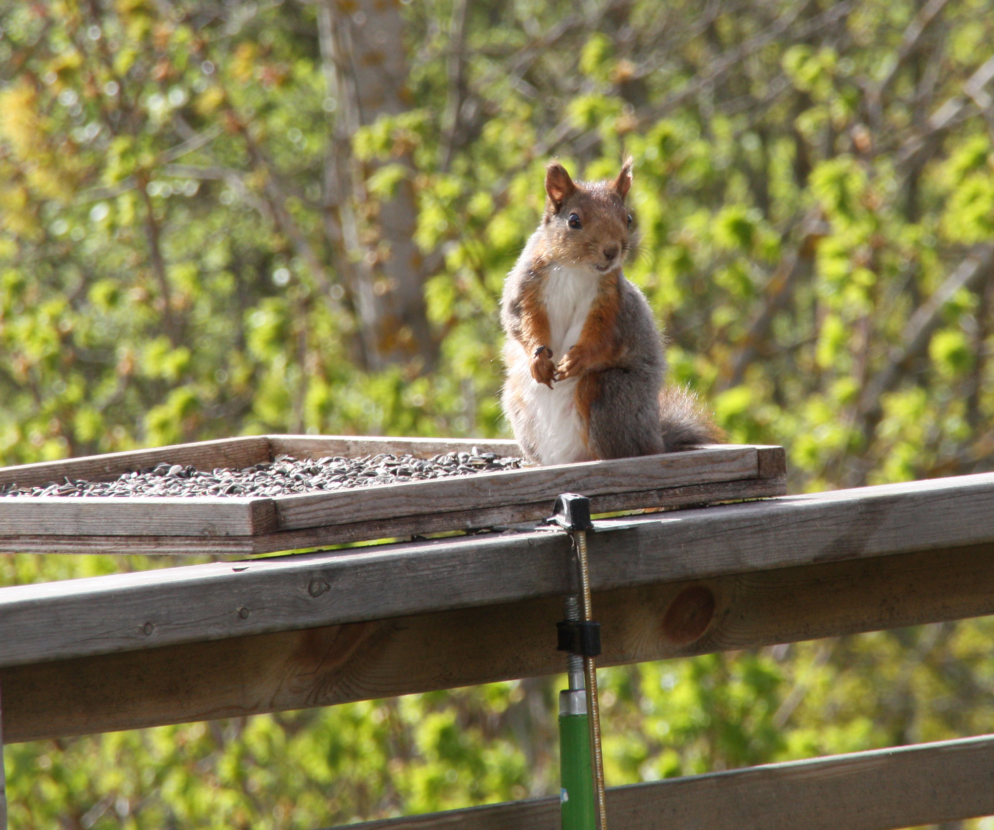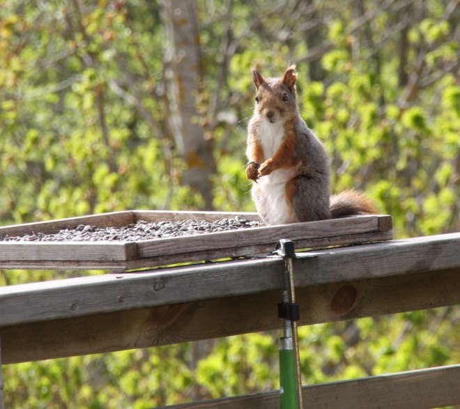 Vårt lilla fågelbord har varit en populär samlingsplats för allehanda fågelarter under vintern och våren. Men uppenbarligen gillar även däggdjur solrosfrön. Gratismat är alltid gott.