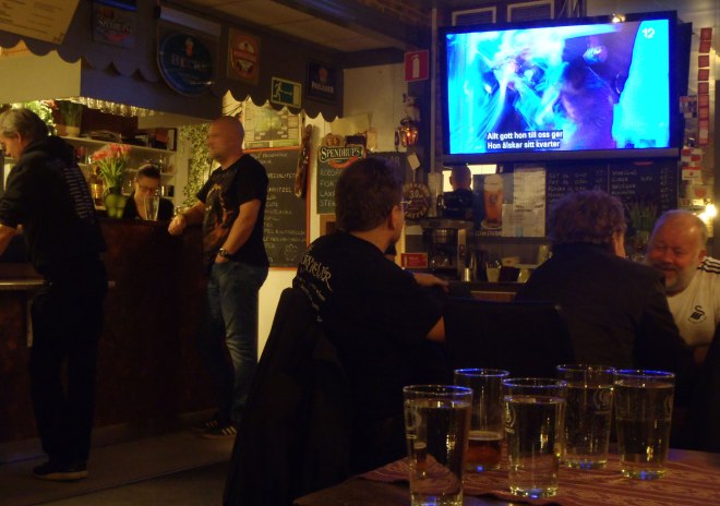 Next day: surprises! Train journey to an unknown location, which proved to be Sundsvall. There, funnily enough, almost everyone we saw was from Kramfors… Transportation via the Bishops Arms to Mother Augusta’s Kitchen and a great dinner. Then on to the big surprise: the Motown show with Afro-Dite in Tonhallen. Couldn’t be better, especially for an old ”disco queen”! (Sigge’s words.) Another brief visit to the Bishops Arms, then the night train towards Narvik back to Kramfors, where we made a quick visit to the Träffen before going home. (The photographer was apparently quite moved, the quality isn’t great.)