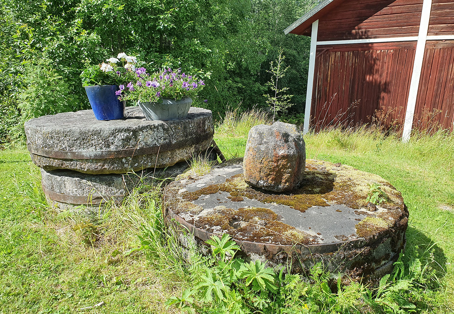 En av byggnaderna, naturligtvis finns det ”antikhandel” och försäljning bakom dörrarna. One of the buildings, of course there are ”antique shops” and sales behind the doors.Kvarnstenar, om de har använts till att mala sjömalm eller mjöl vet vi inte. Millstones, whether they have been used to grind ore from the lake or flour we don’t know.Stångjärnshammare i bedrövlig omgivning. Bar iron hammer in miserable surroundings.Vattenhjul. Hur tråkigt är det inte att se det så här? Waterwheel. How sad is it to see it like this?Vattenhjul och träränna från sjön. Water wheel and wooden chute from the lake.De gamla fasaderna skulle behöva lite omtanke. The old facades could use some care.En av de bättre bevarade byggnaderna, detta är baksidan på ”antikhandeln”. One of the better preserved buildings, this is the back of the ”antique shop”.De gamla arbetarbarackerna är välhållna, men det beror nog mest på att det faktiskt bor människor i dem. The old workers’ barracks are well maintained, but that is probably mostly due to the fact that people actually live in them.Det här är symptomatiskt för platsen. Loppisen fylls på, men man vill inte se plastblommor i den här typen av fönster. This is symptomatic of the location. The flea market is being replenished, but you don’t want to see plastic flowers in this type of windows.