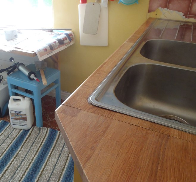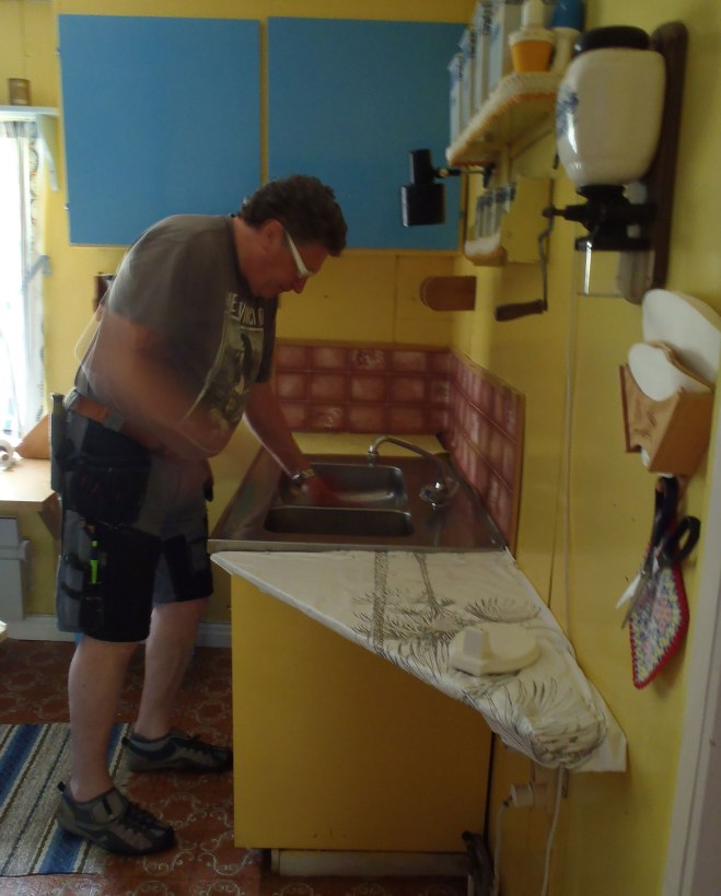 På något sätt kom en begagnad diskbänk i vår ägo och vi tänkte att den kunde passa i köket i Britts och Johns stuga, eftersom diskbänken där är för låg och obekväm att använda. Sagt och gjort. Arbetet påbörjades.