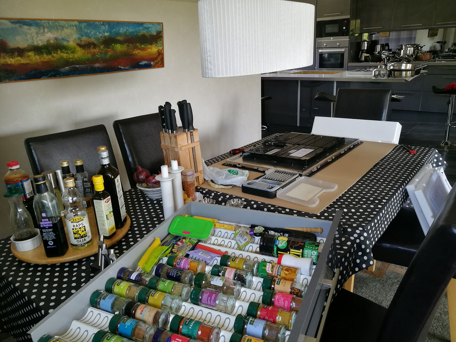 För att inte tala om hur stökigt det var med lådorna under spisen som måste flyttas med alla grejor i dem. Not to mention how messy it was with the drawers under the stove that had to be moved with all the stuff in them.