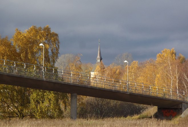 Gångbron över Huddingevägen ska snart passeras. På andra sidan Brännkyrka kyrka./The bridge over Huddinge Road will soon be passed. On the other side Brännkyrka church.Örby slott/Örby Castle.Verk av Ruben Nilson./Work by Ruben Nilson.Ruben Nilson av/by Bitte Jonasson Åkerlund.Brännkyrka kyrka på nära håll. Det märks att det är Alla helgons dag./Brännkyrka church close up. It is apparent that it is the Day of All Saints.