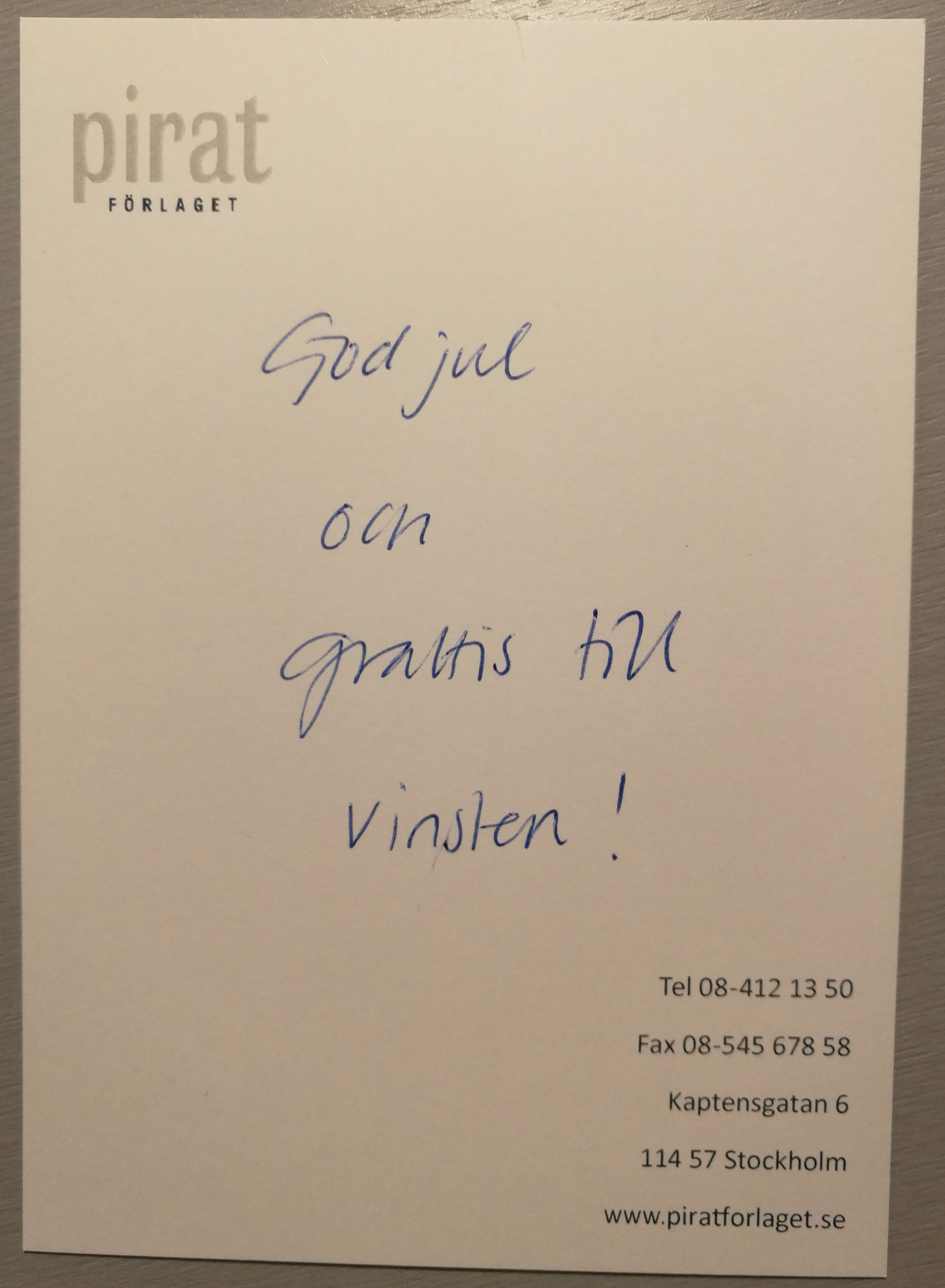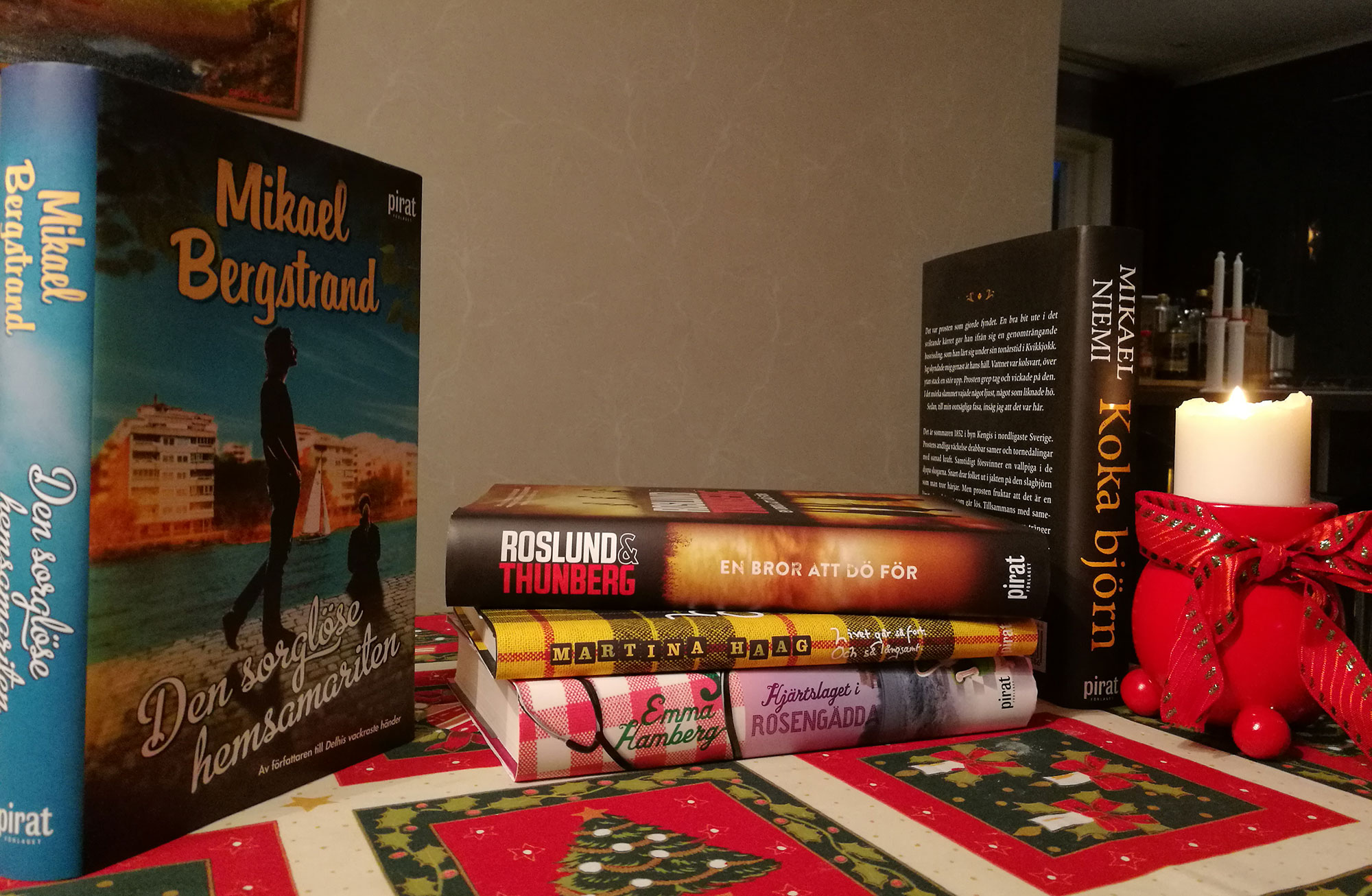 En dag såg tunnelbanan annorlunda ut när det var dags att åka hem från jobbet. Dekorerad med böcker och bokhyllor (bilder så klart, inte riktiga). Inuti vagnen fanns en uppmaning att ta en bild – vilket resenären uppenbarligen gjorde – för att lägga ut på Instagram tillsammans med ett julrim – vilket resenären uppenbarligen gjorde. Det ledde till en oväntad julklapp/vinst i rimtävlingen. Plötsligt landade fem av årets bästsäljare från Piratförlaget i vår brevlåda!