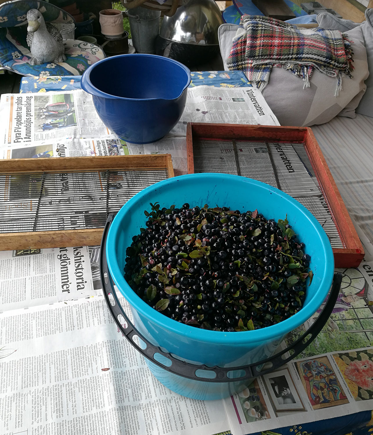 Twice we have been out on blueberry hunting this year and we have collected just enough (or possibly too much) berries. A total of just over 9 kg or 13 liters. All of it has become blueberry marmalade, a version that is even better tasting than last year’s. We have also learned that blueberry stains on the hands are removed with lemon.