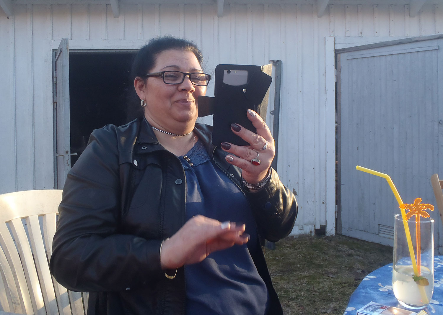 Despina skär upp födelsedagstårtan. Despina cuts the birthday cake.Valeria, nyanländ från Rumänien, fångar evenemanget. Valeria, newly arrived from Romania, captures the event.Samtal över grillen/A talk over the grill: Halma, Sigge, Antoun, Nadil, Sara (reservation för namnfel/for name mistakes).