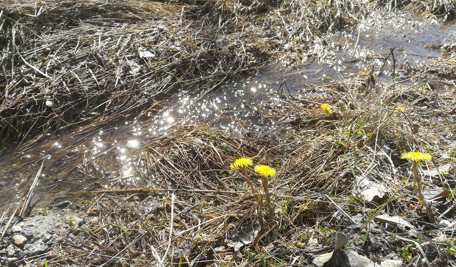 Tussilago och solglitter i dikesvattnet gör oss glada. Coltsfoot and sun glitter in the trench water make us happy.Det är mycket snö kvar ovanför staden och det betyder mycket smältvatten i Kramforsån. There is a lot of snow left above the town and that means a lot of melt water in Kramforsån.Sol och vatten. Sun and water.